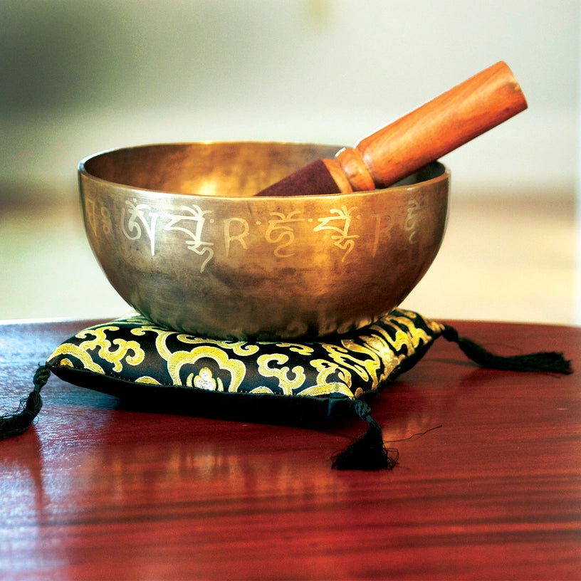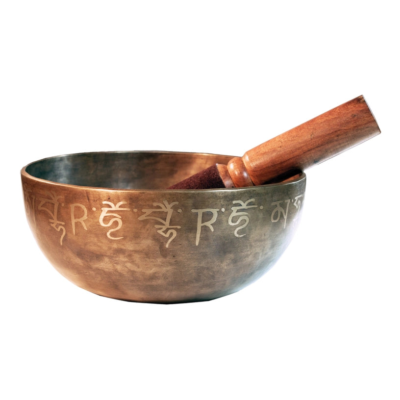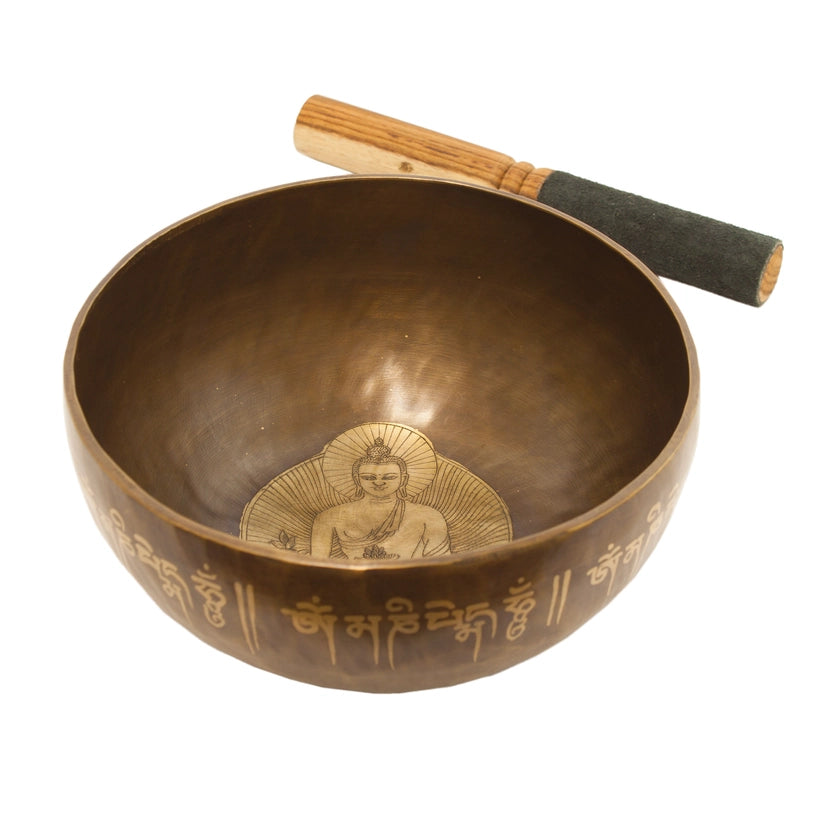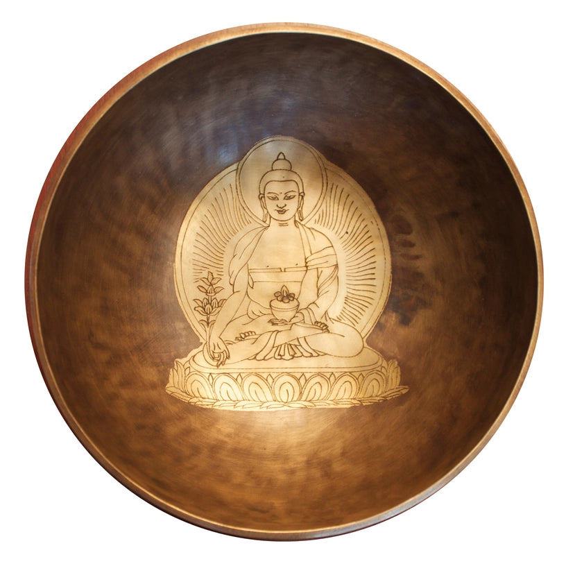 This handbeaten and hand-etched bowl features the healing mantra of the Medicine Buddha on the rim, and an exceptional and exclusively designed depiction of the deity in the bowl center. A tap and circling of the rim elicits powerful healing tones. 8"dia. X 3.6"h