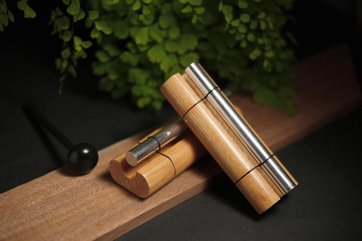 We live in a vast ocean of sound. But what is the one made by a single drop of water? With a gentle tap of the mallet, this chime emits one only powerful and long-lasting note that helps to focus and calm the mind. Often used in meditation and healing, it's an effective way to start a class, meeting, yoga practice or call guests to dinner! Take a deep breath, play it quietly, listen, feel, relax, refocus, re-energise. The Zenergy Chime - Mini is perfect to take with you while travelling. Musical note: La Content: 1 silver polished aluminum rod, mallet, cherry finish ash wood